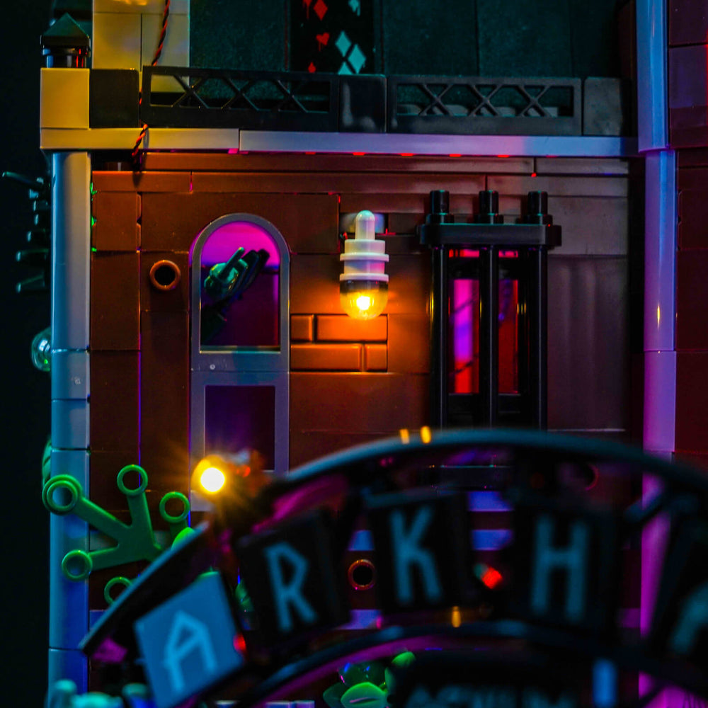 • Farben des Chaos: Im Inneren tobt die Anarchie. Kontrastreiche LED-Lichter in Giftgrün, Blutrot und Lila dringen aus den Zellen und Türmen. Sie visualisieren die kranken Geister der Insassen – vom manischen Lachen des Jokers bis zu den tödlichen Rätseln des Riddlers.