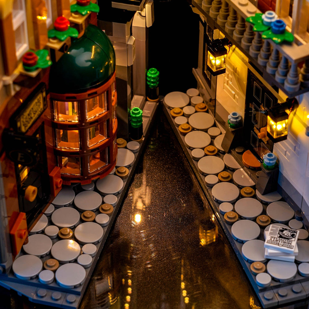 Viktorianische Gemütlichkeit: Das gesamte Set ist in ein sanftes, warmgelbes Licht getaucht, das perfekt den Schein alter Straßenlaternen im nebligen London imitiert. Es beleuchtet die feinen Texturen des Mauerwerks und der Pflastersteine und schafft eine Stimmung, die sowohl nostalgisch als auch geheimnisvoll ist.